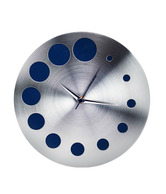Brand: Cosmosgalaxy Well-crafted round stainless steel wall clock Colour: Silver Diameter: 25 cm Elegant design timepiece for your entrance area, living room or your study Material: Steel Movement type: Quartz Runs on battery (not included) The increasing size of blue circles denotes time for you Made of high-quality material for a lasting time experience Product code: I0177